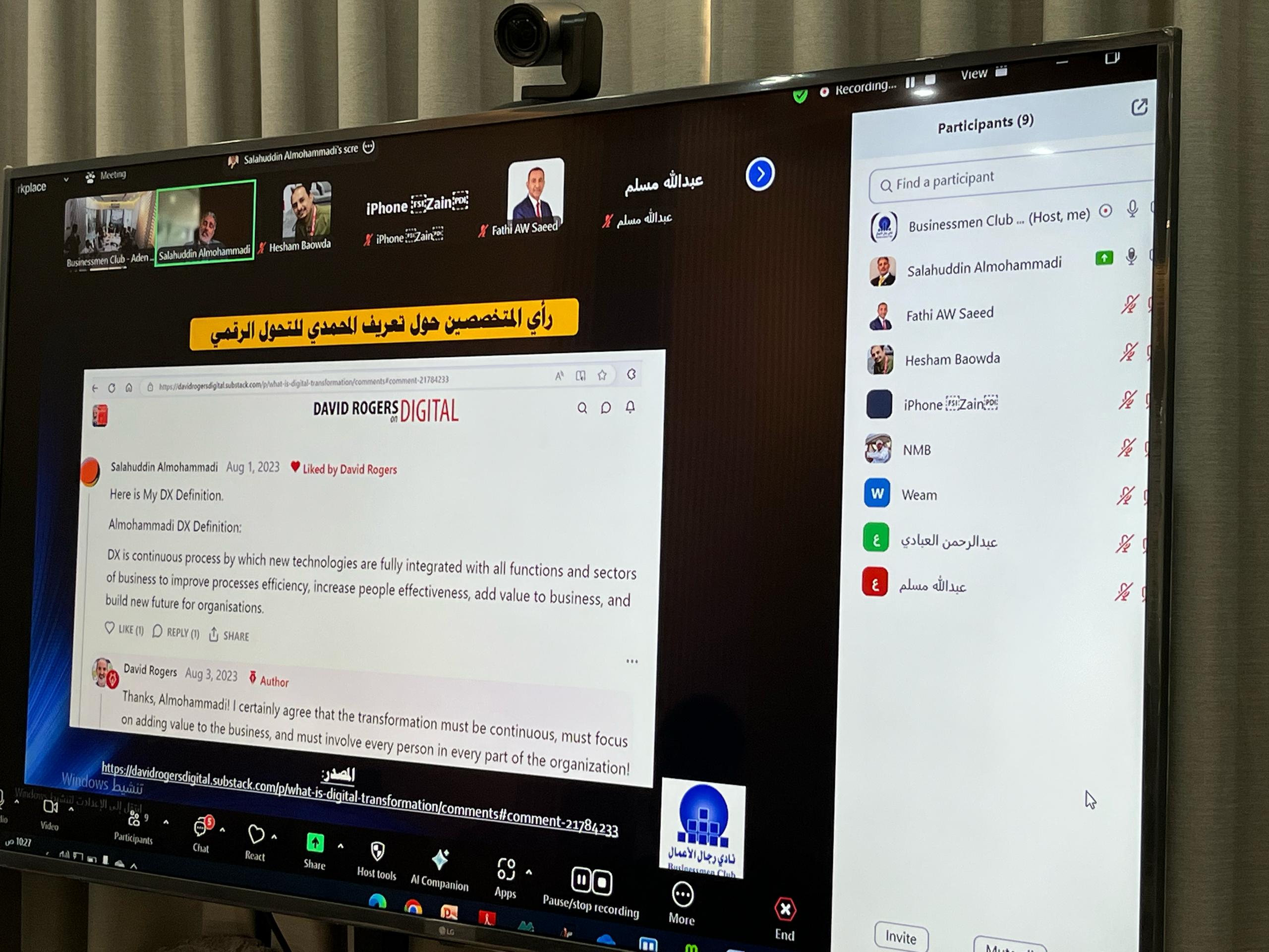 شارك في الجلسة عدد من أعضاء النادي حضورياً وعبر منصة زووم، وتناولت محاور رئيسية حول التحول الرقمي والابتكار، من حيث التعريف، الأهمية، القيادة، والعلاقة بينهما، إلى جانب استعراض تجارب وتوجهات عالمية.